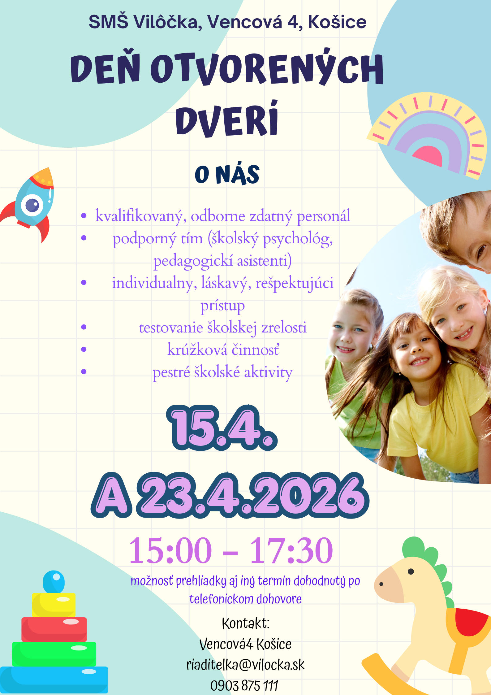 Vieme sa Vám prispôsobiť. Zariadenie je otvorené celoročne od 6:45 do 17:15. Otváracie hodiny Vám však vieme flexibilne prispôsobiť. Radi sa o dieťatko postaráme i v nočných hodinách, prípadne počas víkendov a sviatkov.